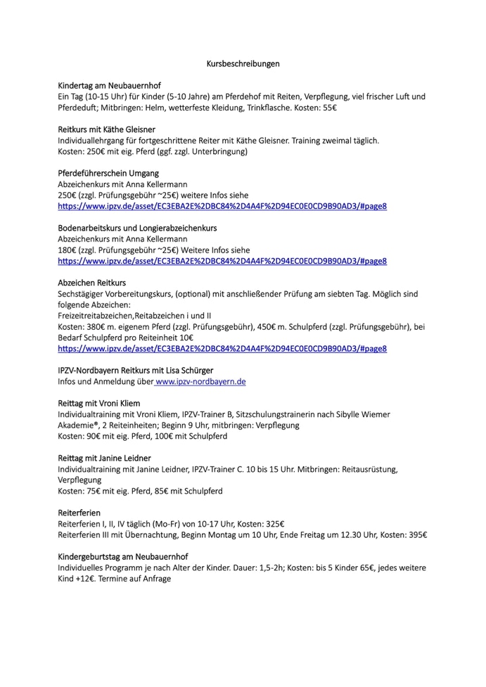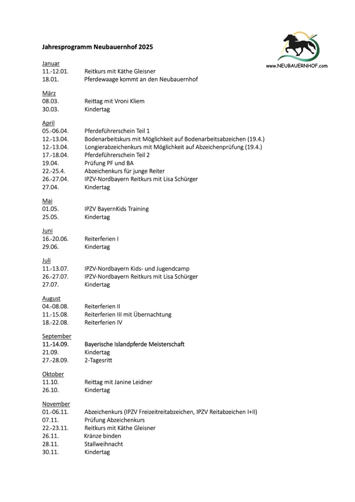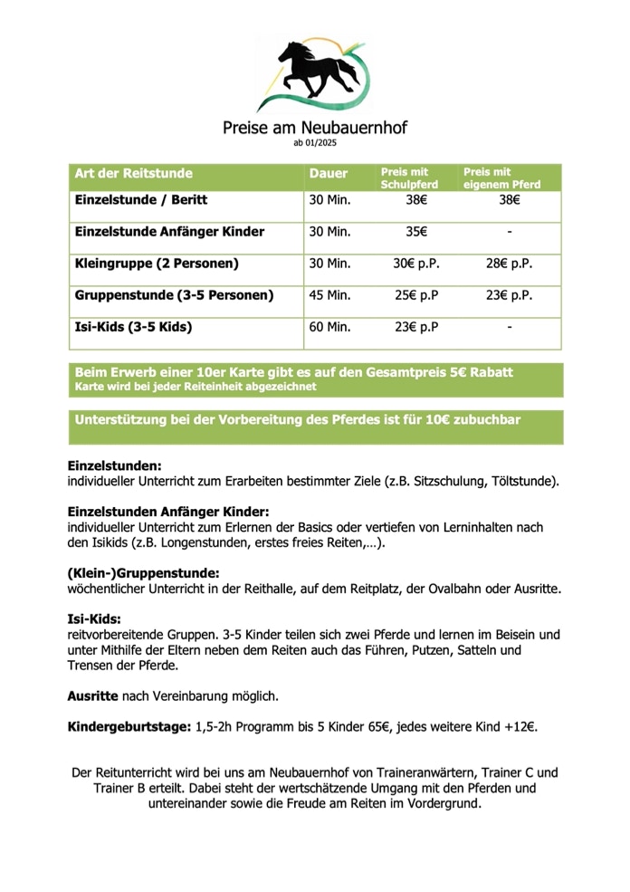 Der wöchentliche, regelmäßige Reitunterricht findet von Montag bis Freitag außerhalb der bayerischen Schulferien statt.